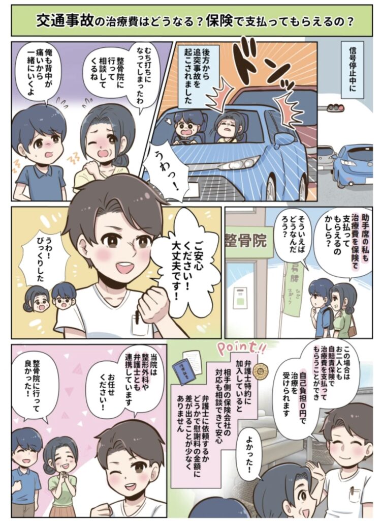 交通事故で受けた被害については、自賠責保険から治療費を支払われるため、ご負担はありません。